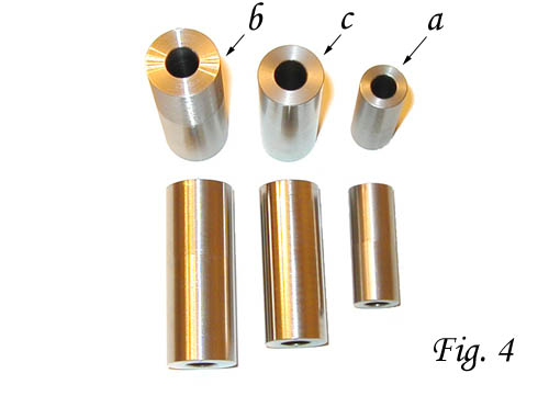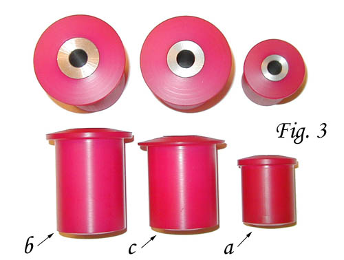 installation of the suspension components. 2. Once the front upper and lower control arms have been removed from the car, use a hydraulic press to press out the OEM rubber bushings, or have a machine or suspension shop perform this service for you. 3. The center pins in your kit are intended to be a loose fit and will not be installed with the nylon bushings when they are pressed into the suspension components. Set the center pins aside, since they will not be installed until you are ready to replace the suspension components on the vehicle. 4. There are three different sizes of bushings in the front bushing kit, as shown in Fig. 3 below. The smallest size, of which there are four, are for the front upper control arms, and are labeled a in Fig. 3 below. Their position is illustrated in Fig. 1 above as a, two bushings for each upper control arm. Press the small bushings into the upper control arm in positions a in the direction of the arrows in Fig. 1 above, so that the flanged ends of the bushings face outward, in the opposite directions of the arrows. ![]() 6. The two remaining large bushings (labeled c in Fig. 3) are intended to be installed in position c in Fig. 2 above, one per lower control arm. Press the nylon bushing into the lower control arm in position c in the direction of the arrow, with the flanged end facing outward from the control arm in the opposite direction of the arrow. 7. Once all eight bushings have been installed, follow the Mazda Shop Manual instructions for replacement of the front suspension components. Before installing the bolts which hold the control arms on the car, coat the outside surface of the stainless steel center pins (shown in Fig. 4 below) with anti-seize lubricant, and slide them into the centers of the appropriate nylon bushings, wiping off any excess. Again, the center pins are designed to be a loose fit and should slide and rotate freely within the nylon bushings. The four shortest pins (labeled a in Fig. 4 below) are intended to be installed in the bushings in position a in Fig. 1 above. The two longest pins (labeled b in Fig. 4) are intended to be installed in the bushings in position b in Fig. 2 above. And finally, the two intermediate length pins (labeled c in Fig. 4) are intended to be installed in the bushings in position c in Fig. 2. ![]() 9. Complete the reinstallation of the front suspension components following the Mazda Shop Manual instructions. Once installation is complete, we highly recommend that you have the car realigned by a professional suspension shop in order to ensure that your suspension geometry is correct. 10. Congratulations! You now have the highest performance front suspension bushings money can buy on your RX-7, and you should feel a night-and-day difference in the reaction of the car to variances in road surfaces when compared to the OEM rubber bushings. |