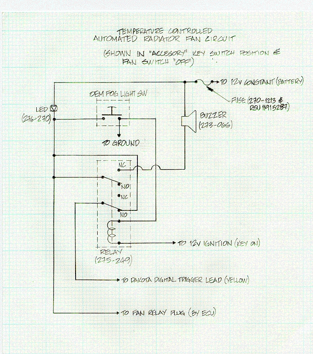 Sounds great. But, if Matts modifier doesn't happen, I will use a simple dp relay and the thermo-switch to kick in a shunt resistor to make the departure from 'normal' occur at 230F, vs about 250F now as I recall. This, with a 210F single wire thermo-switch (miata?) should do it. Very simple, just need to find ign hot under the hood to power the relay.