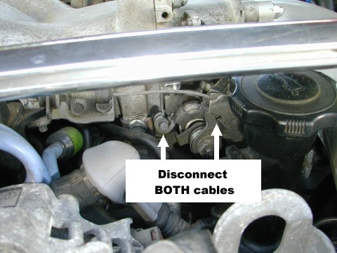 One cable runs along the intake manifold and is the most evident. The second goes to the throttle body from the drivers side of the car. Just push the springs back and release the cables. |