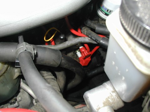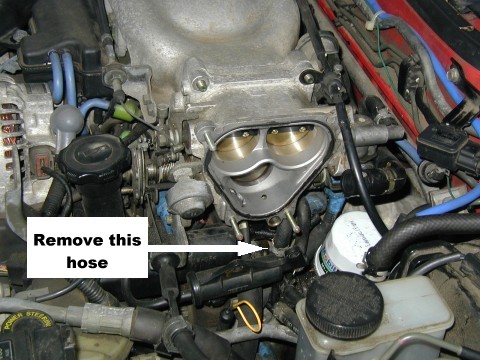 | The coolant hose is almost directly underneath the throttle body. As long as you can position the clamp so that you can get pliers on it, you should be all set. If the hose is really stuck, twist it before trying to pull it off. Also pulling the hose will result in all the coolant in the throttle body coming draining out. Be careful of how hard you pull to minimize splashing. You could also remove the coolant hose at the rear of the throttle body as well, but as you'll see it's unnecessary. | ![]() |