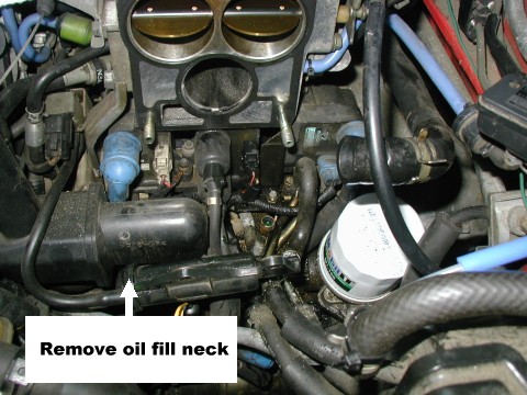 6. After detaching the (2) two small hoses attached near the filler cap, the upper portion of the oil filler neck must now be pulled away from the "Trailing Number 1" coil wire to allow its removal.