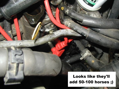 | I'm using Taylor-Vertex custom fit Spiro-Pro wires. They look a little bit better than the stock NGKs don't they? I came close to buying MSD wires (which I have on my Mustang), but most people said that they liked the Taylor wires and that the boots were slightly better designed. Can't believe that they were only $26 from Summit Racing. They were cheaper than the 4 Platinum plugs I got... | ![]() |